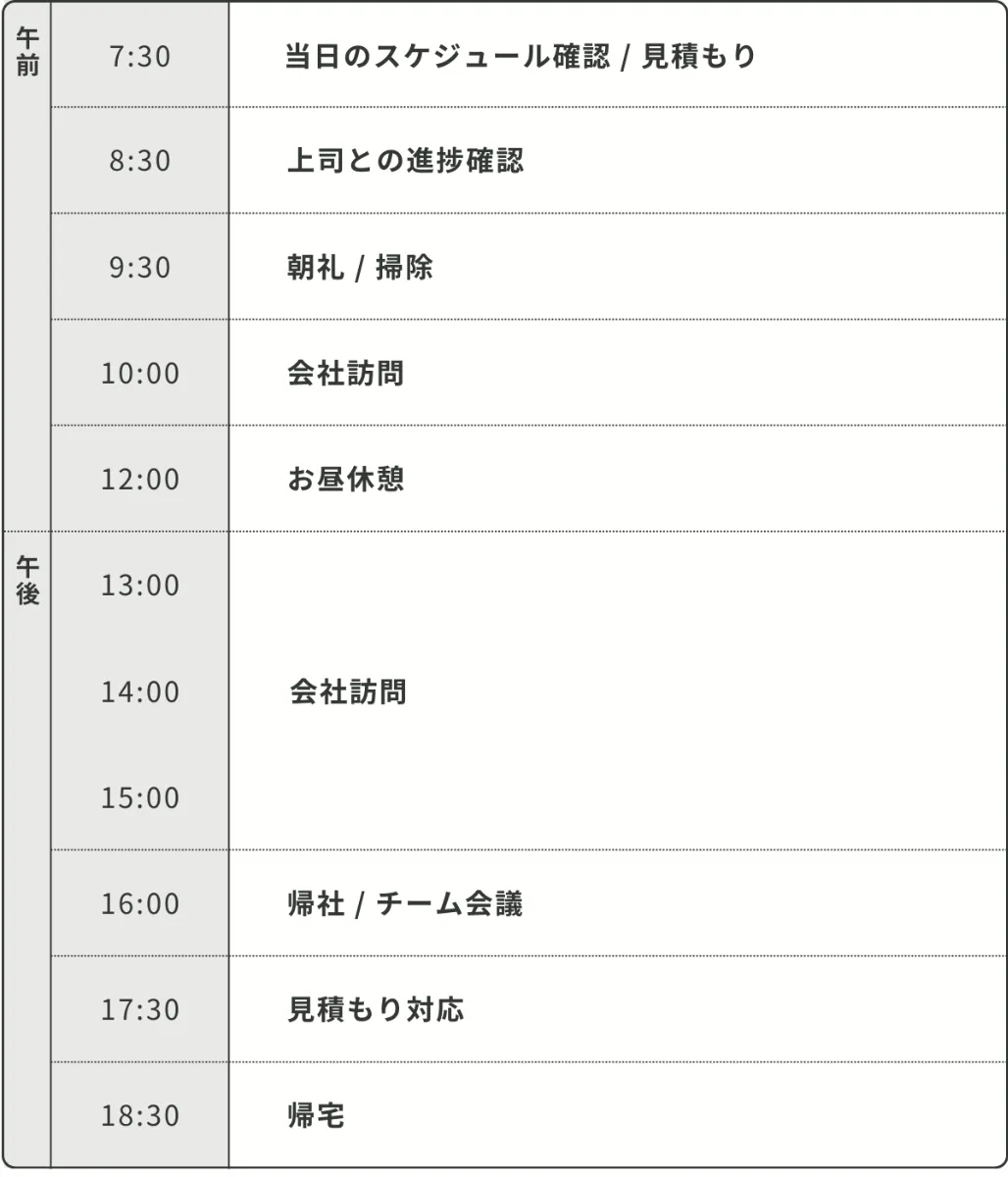 関東のお客様を中心に営業活動を行っています。外出の時は基本的には4社以上訪問し、千葉や埼玉など遠方のお客様へ訪問する際には100km以上車を走らせることもあります。